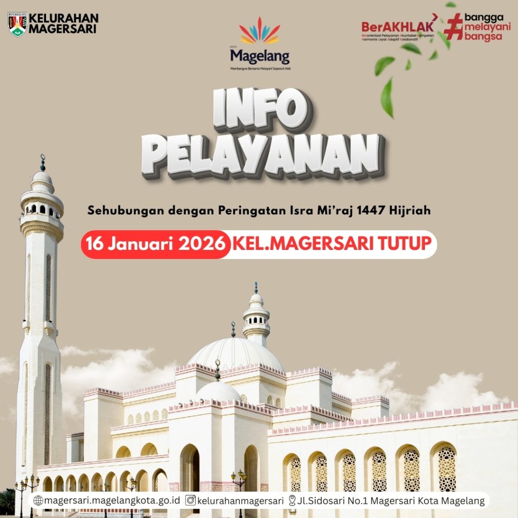 Pemberian Bantuan CSR dari PT Pertamina Untuk Warga Magersari Admin Magersari | 16 Januari 2026 | Berita Kelurahan Magersari Magersari – Sehubungan dengan Peringatan Isra Mi’raj Nabi Muhammad SAW 1447 Hijriah, diberitahukan kepada seluruh masyarakat bahwa pelayanan di Kelurahan Magersari tutup sementara pada: Hari/Tanggal : Jumat, 16 Januari 2026 Selama penutupan tersebut, seluruh layanan administrasi […]